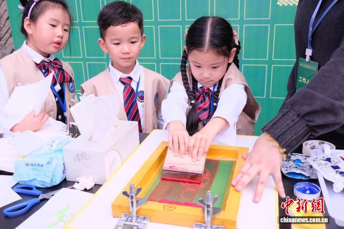 11月8日,小朋友拍摄展出的2010年版画作品《春色》。 林波 摄
